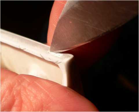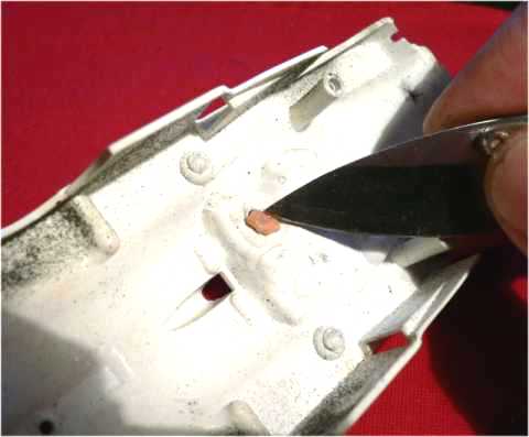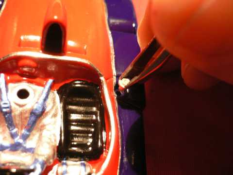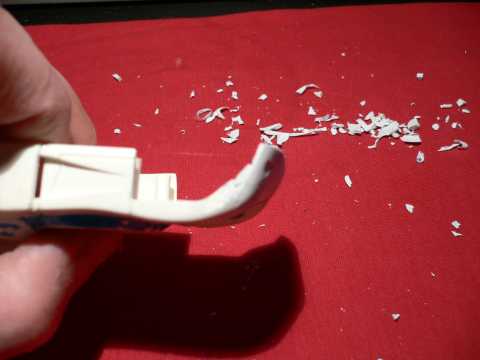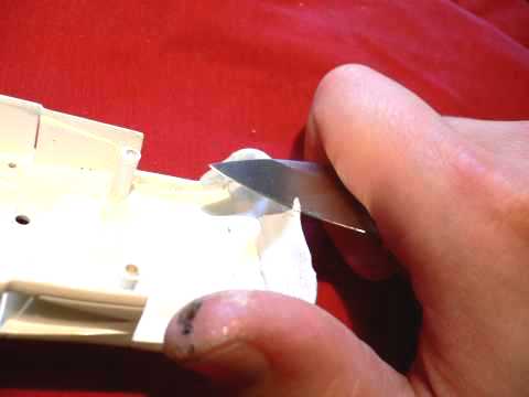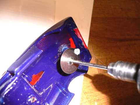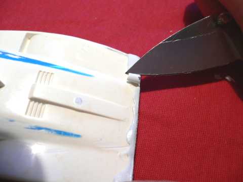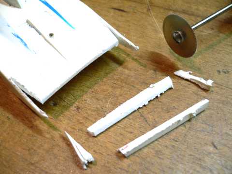 Ich schneide ihre Haltepins ab und schnitze die erste Aussparung ins Heck.