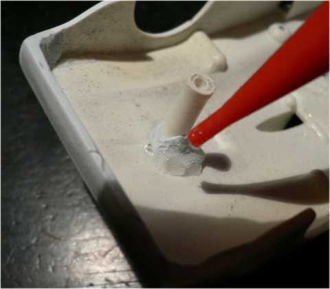 Vielleicht setze ich die Rücklichter hier später wieder ein.Das Einkleben des Karosseriehalters mit der gleichen Masse ist ein Fehlversuch. Um ihn kümmere ich mich erst viel später wieder. Das Bohrloch ist jetzt dafür auch schon gefüllt.