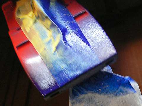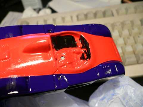 An den Radläufen und den beschädigten Lackstellen male ich die Karosserie von Hand erneut an.Wenn das ein wenig getrocknet ist, müßte ich endlich bereit zum Klarlackieren sein. Pause: 05.11.2004 15:20 Uhr