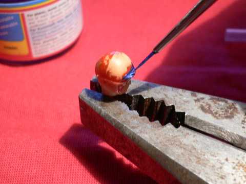 Sekundenkleber. Für den Kopf erhitze ich einen Schraubenzieher und drücke den
