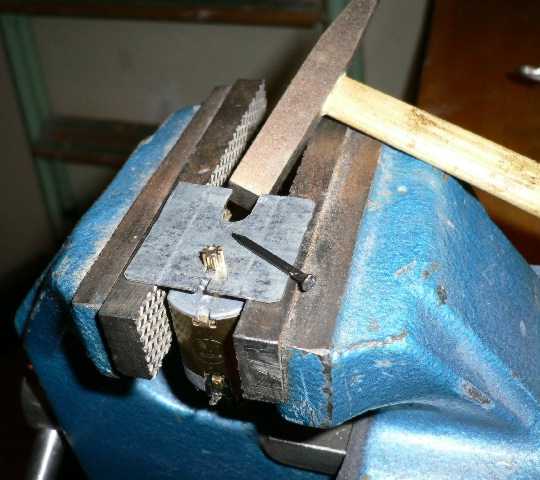 Schraubstock und dient als Widerlager für das Zahnrad, während ich mit einem Hammer die Achse